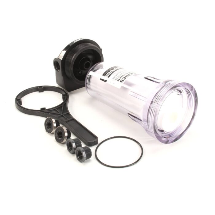 • Clear housing lets you visually inspect trapped particles and makes determining when to change the cartridge easy